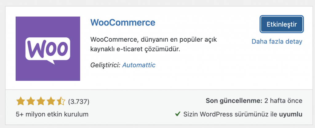 - Arama sonuçlarında, Automattic tarafından geliştirilen (mor renkli logosuyla tanıyacaksınız) WooCommerce eklentisini bulun.